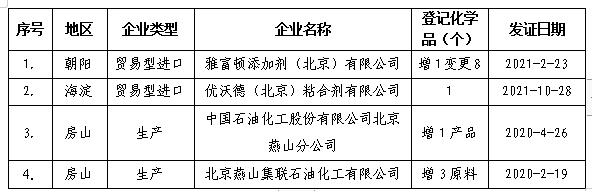 根据《危险化学品安全管理条例》(国务院令第591号)、《危险化学品登记管理办法》(国家安全监管总局令第53号)有关规定,经北京市危险化学品登记注册办公室和应急管理部化学品登记中心两级审核合格,下列4家企业获得《危险化学品登记证书》及危化品登记品种附表(变更化学品仅发此表),证书有效期3年。登记证有效期满后,登记企业继续从事危险化学品生产或者进口的,应当在登记证有效期届满前3个月提出复核换证申请。