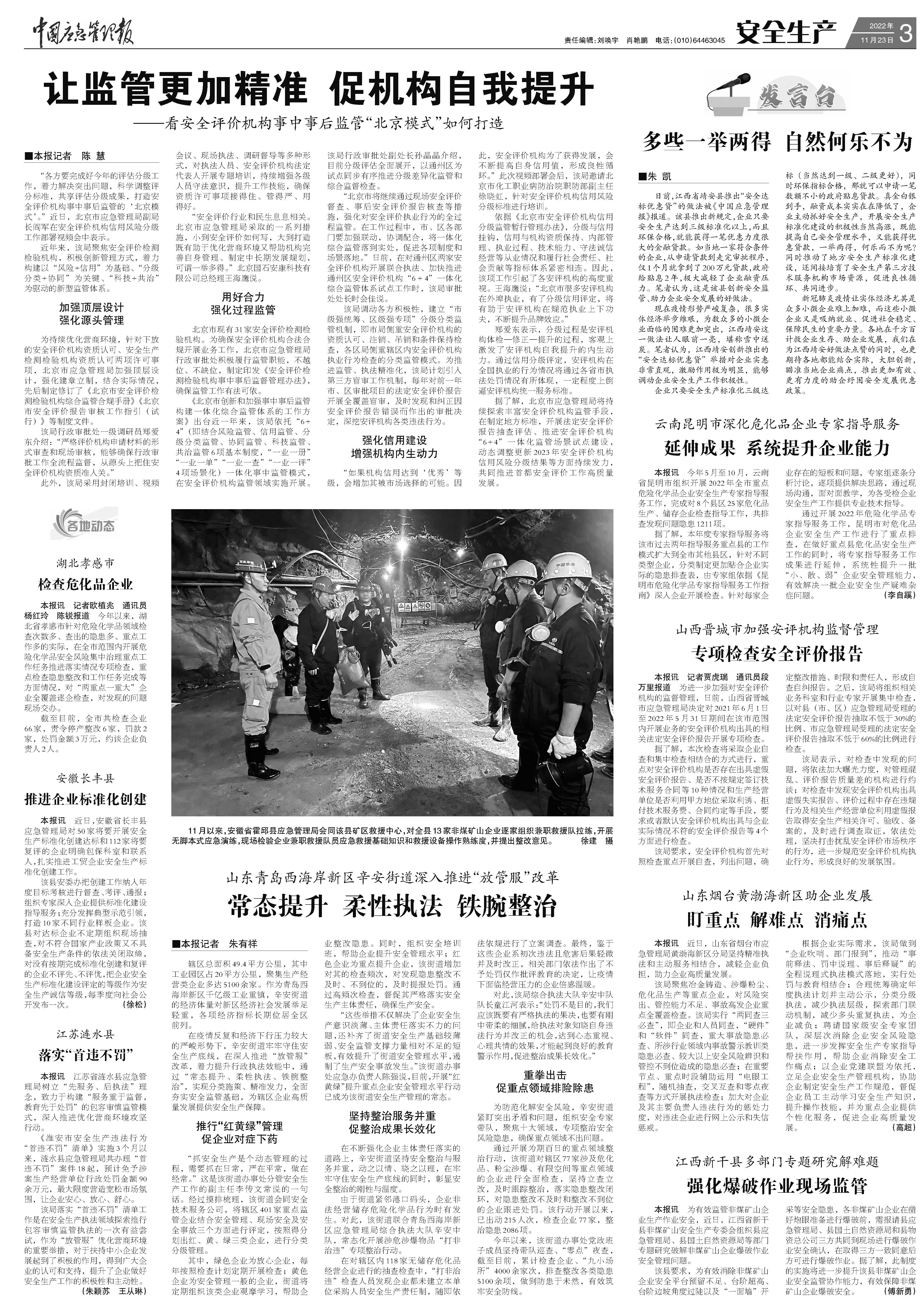 2022年11月23日,中国应急管理报第3版刊发了《让监管更加精准 促机构自我提升--看安全评价机构事中事后监管“北京模式”如何打造》的专题报道。